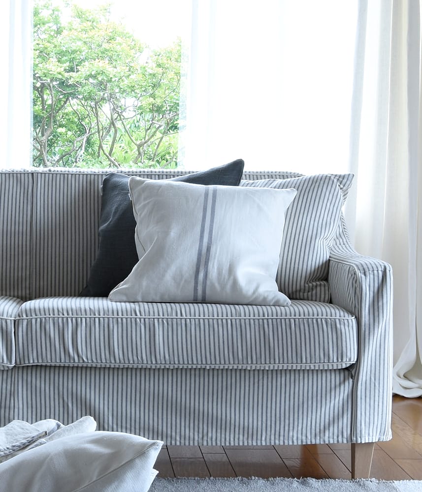 さらりと心地よい手触りの優しい質感が特徴です。シンプルなストライプが大人気のマリンシリーズ生地(マリン6)。ホワイト地に淡いグレーのラインです。