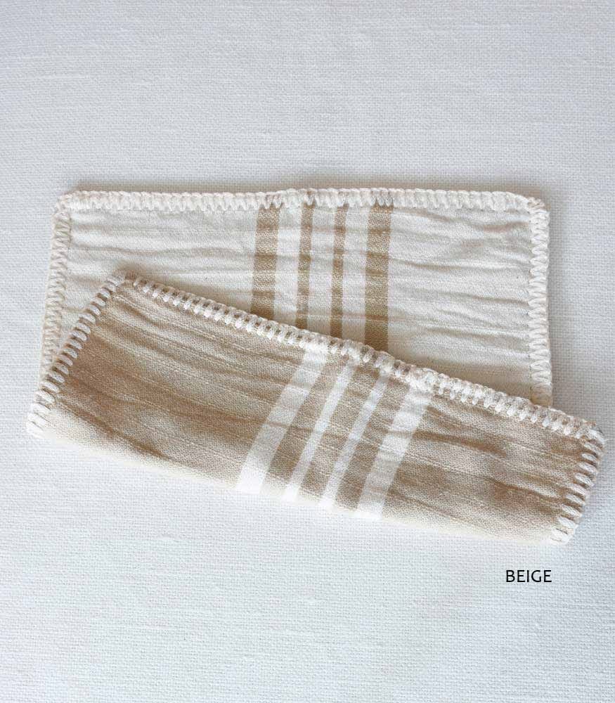 裏表が違う地色で楽しんで使えるリバーシブルで、ベージュと地とカラー時のストライプのどちらもかわいい色合いです。四方に入ったホワイトのステッチがアクセント。