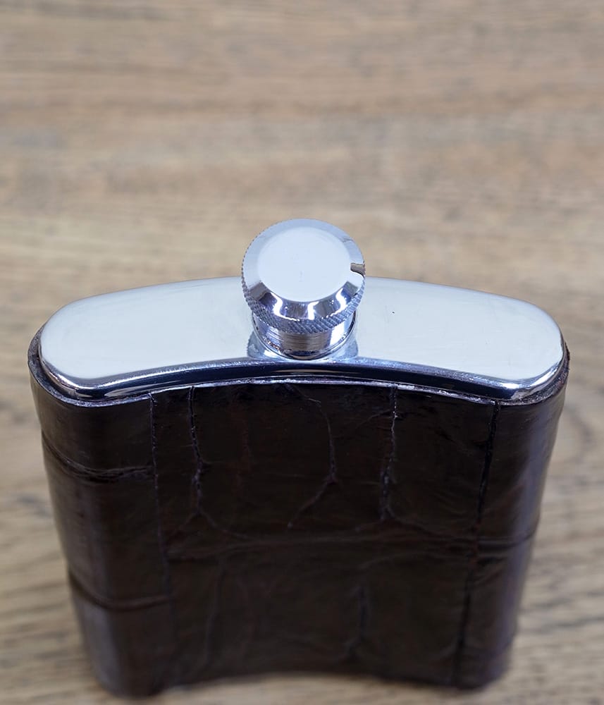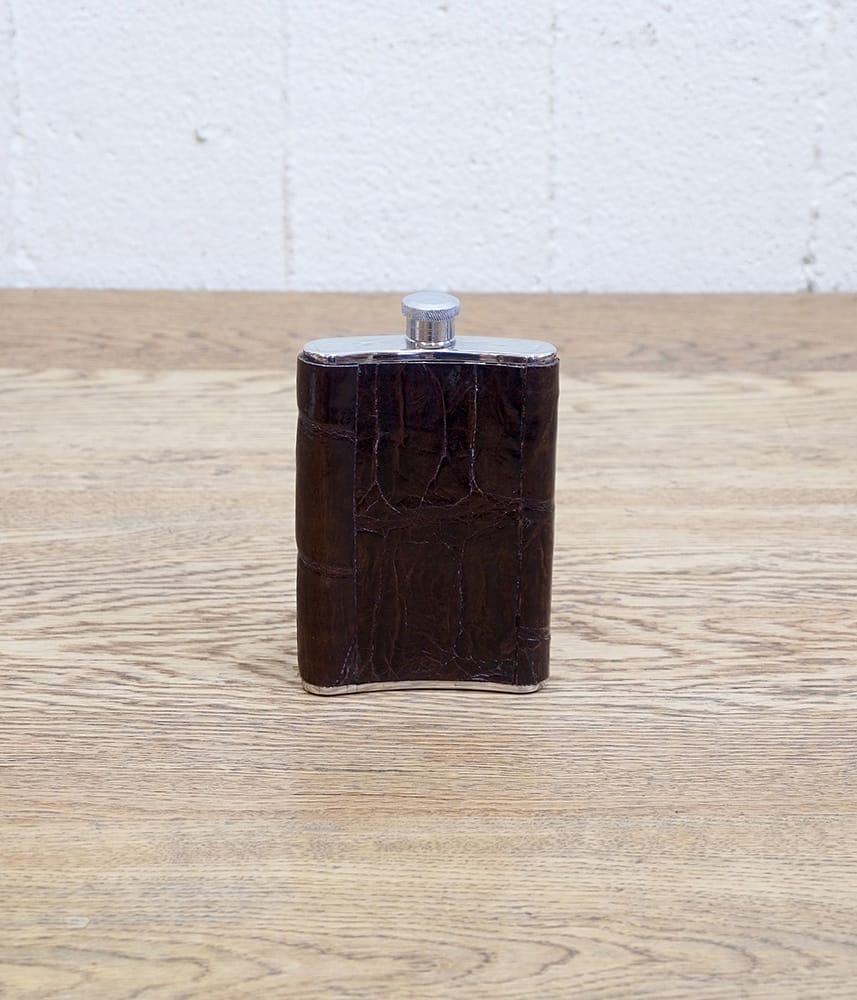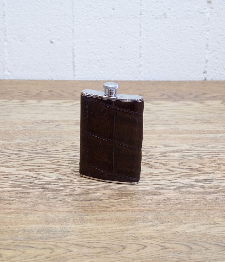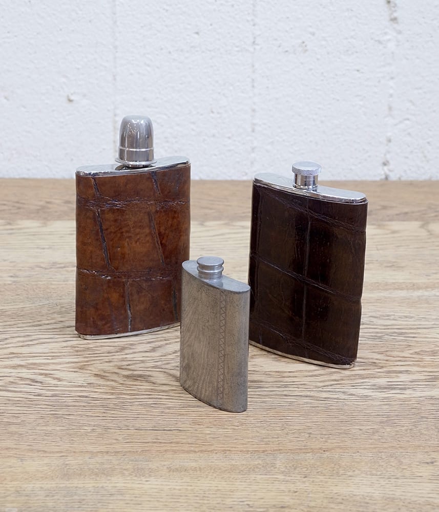 推定1920年代、イギリス製のスキットルは、ウイスキー、ブランデー、ウォッカなど、アルコール度数の高い蒸留酒を入れて持ち運ぶために生まれた携帯用容器のことです。底にはSTAINLESS STEEL、8ozと明記があります。STAINLESS STEELとは日本語で直訳するとステンレス鋼、錆びない(錆びにくい)です。8oz(8オンス)とは大体240mlは入ります。革の質感も高級感があります。古いものですので実際に使うというより鑑賞用としてのご使用をおすすめいたします。その他にも同じようなスキットルがあります(L6)。