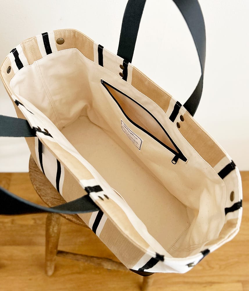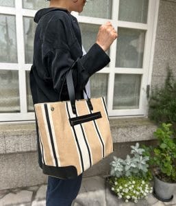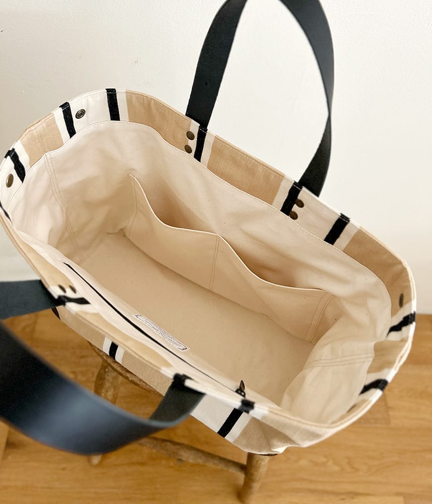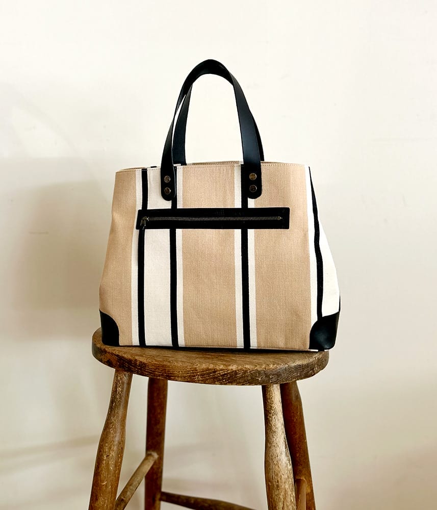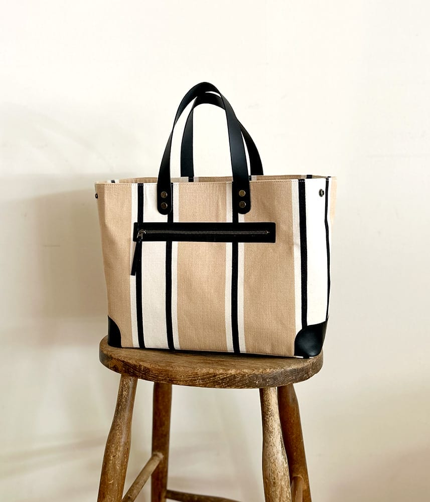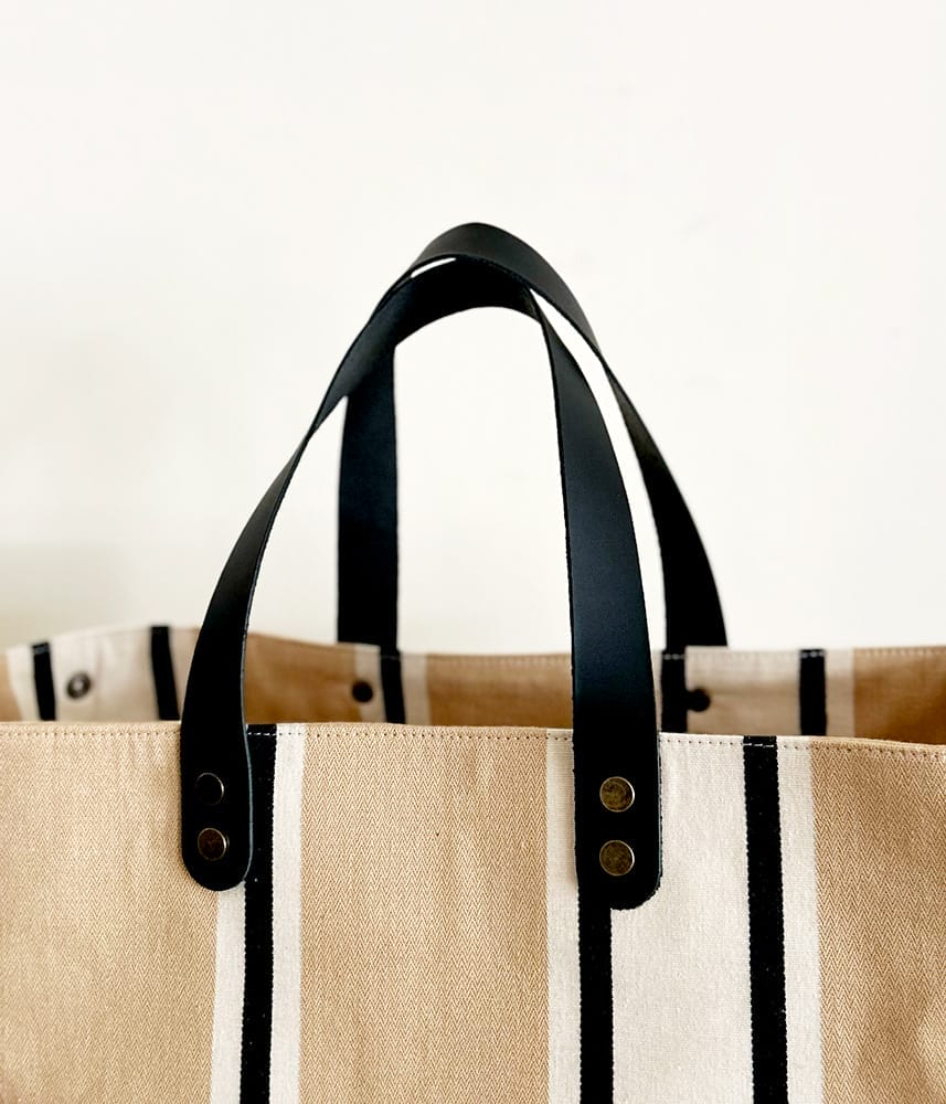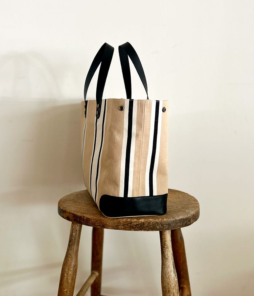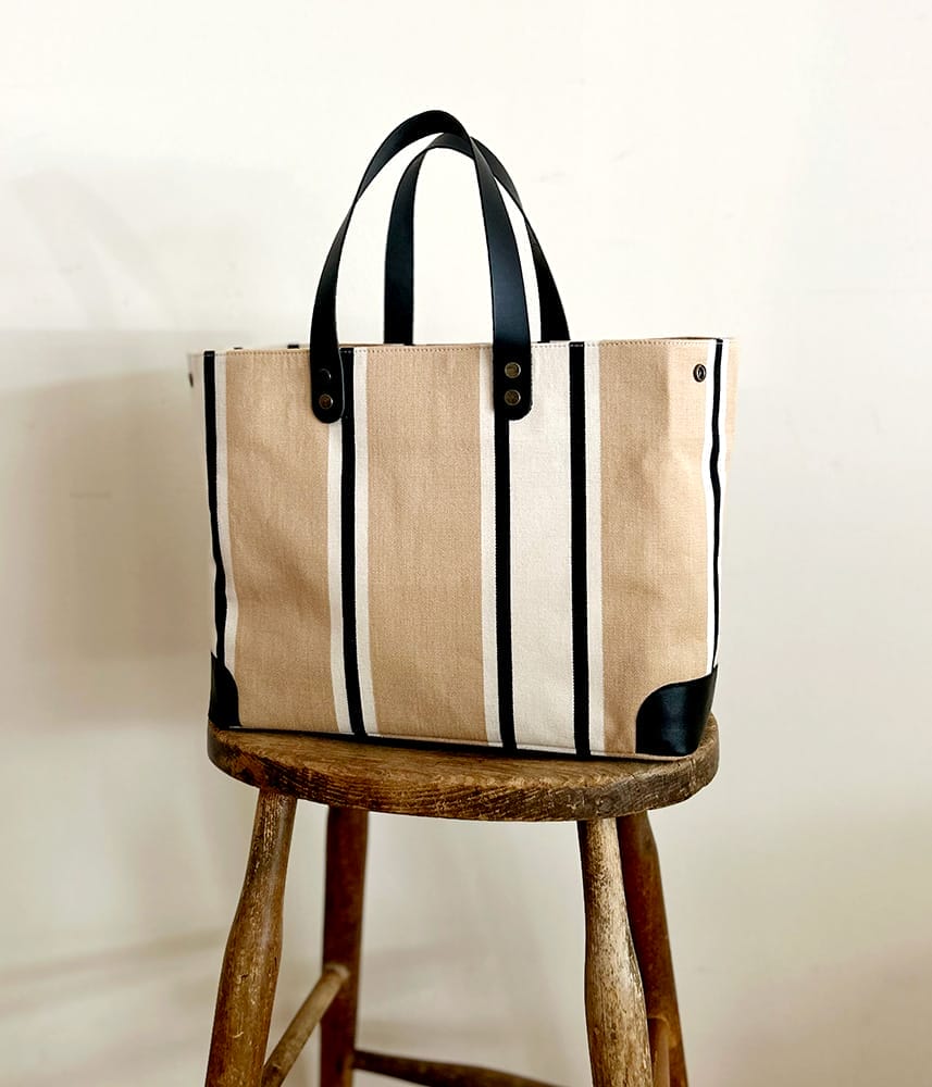 コーナーと持ち手、ポケット口に施した黒のレザーがきりっとかっこいいデザインです。