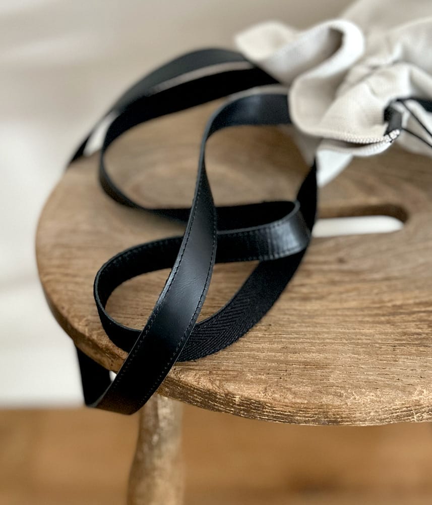 肩紐とサイドに施したブラックのレザーがアクセントになって素敵です。