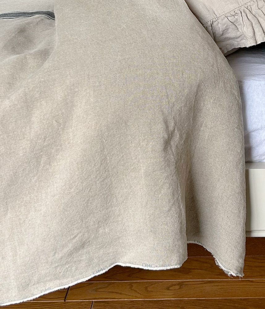 使い込まれたような自然なシワ感と切りっぱなし風の端の仕上げはベッドに掛けただけで絵になる一枚。