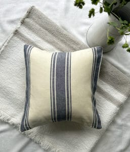 ほんのり黄みを帯びたオフホワイトの生地に、太めのネイビーラインが印象的で、空間にさりげない存在感を与えてくれます。