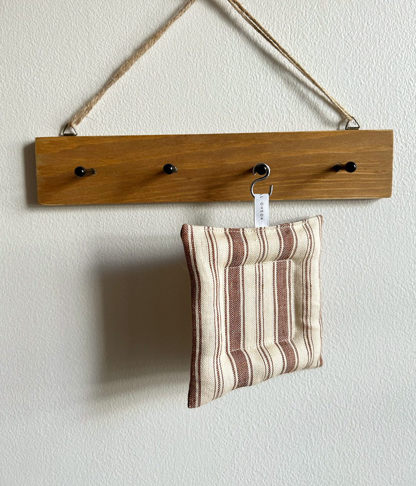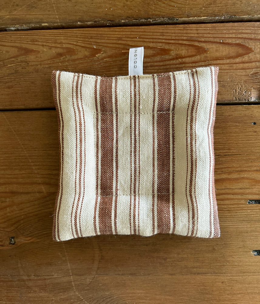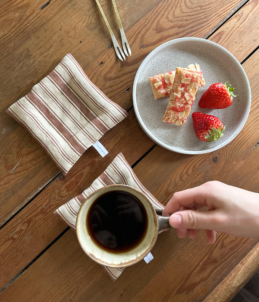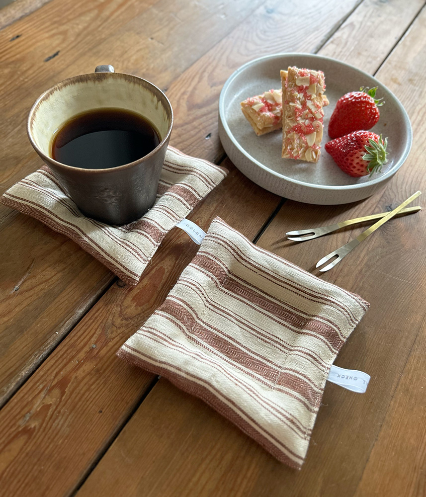 リネンのやさしい風合いに包まれたクッションコースター。