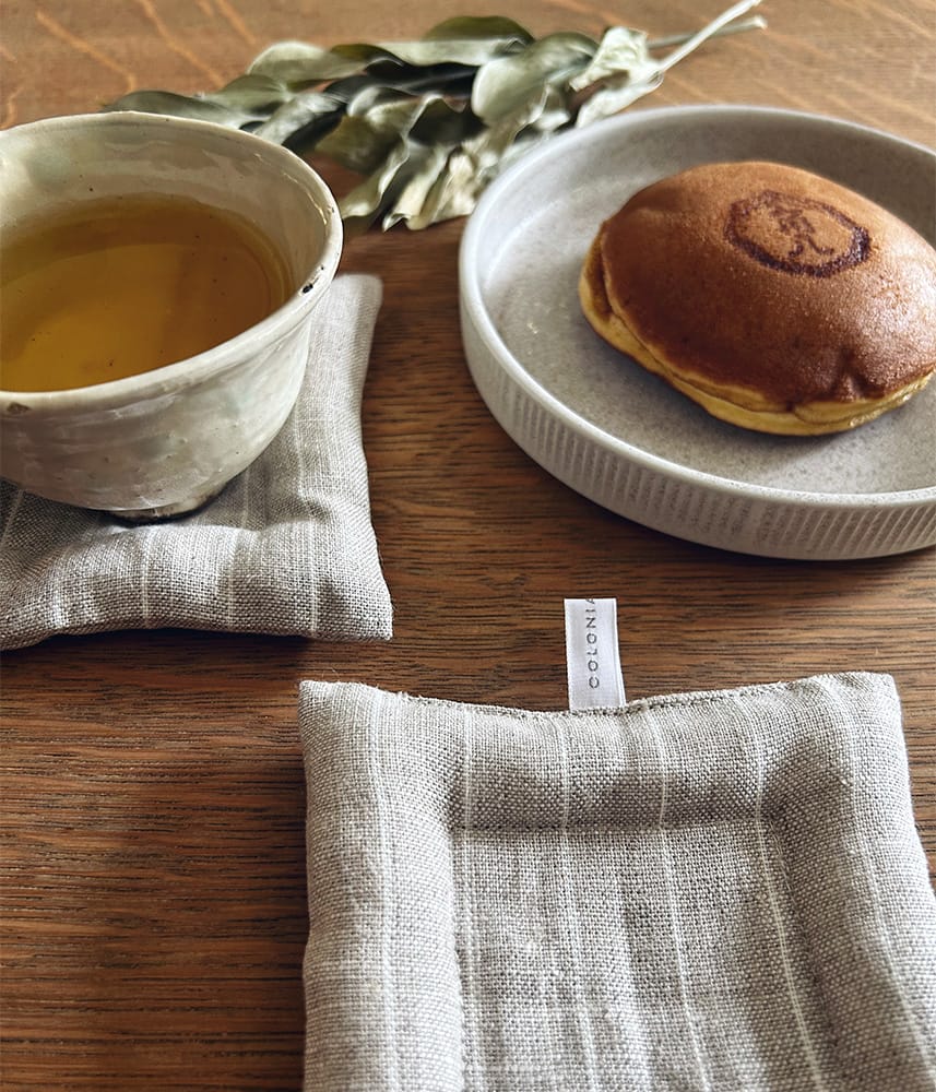 リネンのやさしい風合いに包まれたクッションコースター。