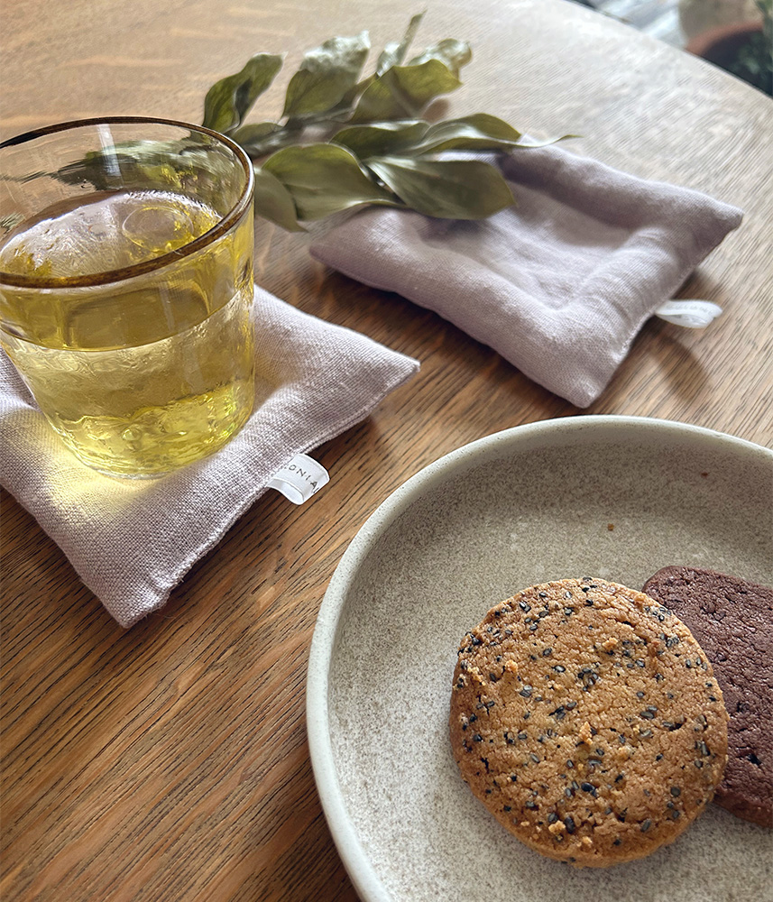 リネンのやさしい風合いに包まれたクッションコースター。