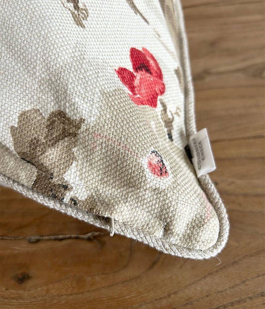 ホワイトリネン地に赤いアネモネが映える花柄クッションは