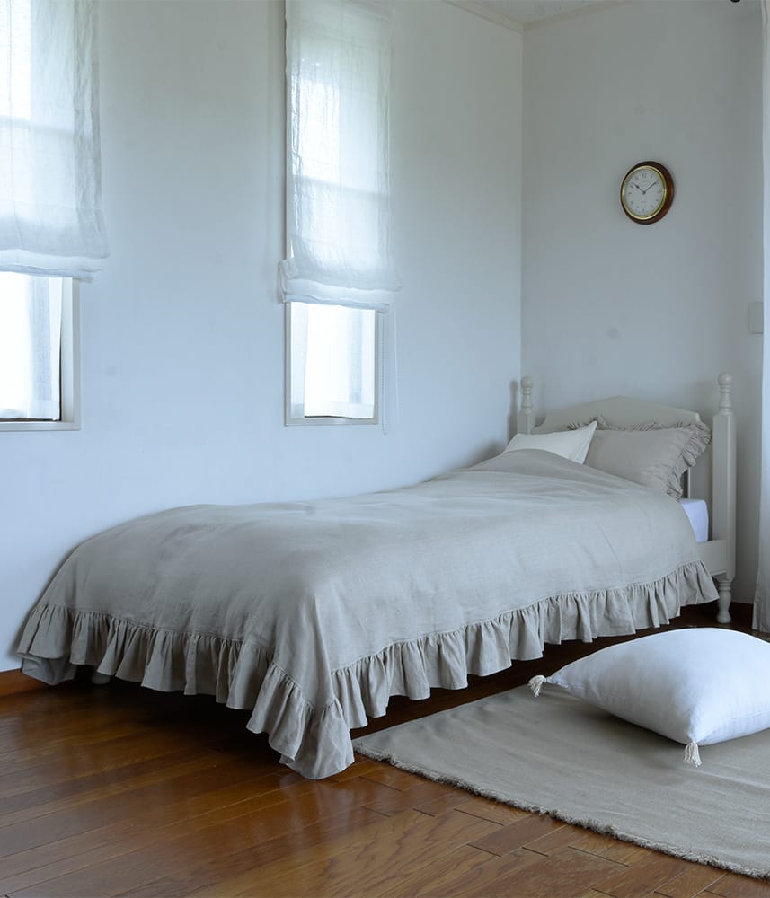 長めのフリルが描く、やわらかな陰影。上品さを纏うリネンのベッドカバー。