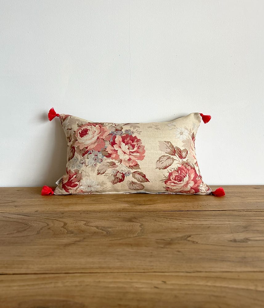 イギリスから直輸入の花柄リネン生地で製作した小さめクッション。