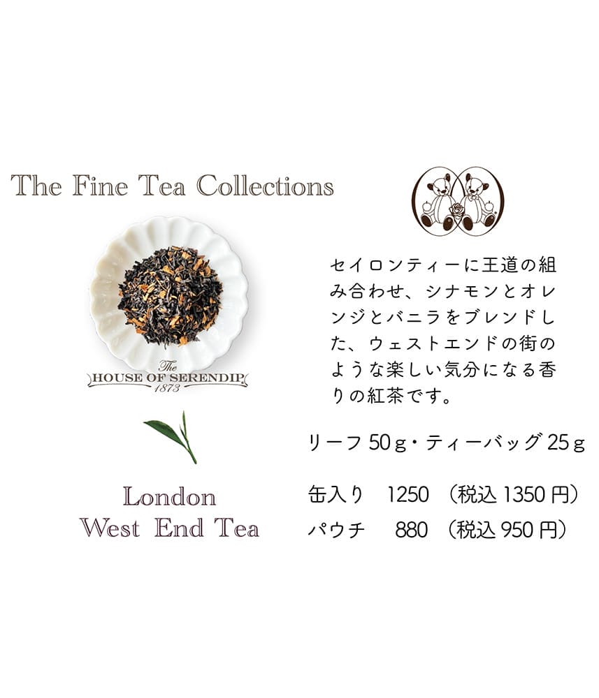 セイロンティーに王道の組み合わせ、シナモン・オレンジ・バニラをブレンドしたウェストエンドの街のような楽しい気分になる香り。
