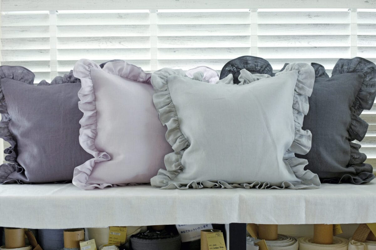 リトアニア製の軽やかなリネンLinaカラーシリーズのフリル付きクッションカバー。 明るく大人っぽいブルーグレーがシャビ―モダンな雰囲気を醸し出します。ガーリーなスタイルでも、色合いで落ち着いた風合いに変わります。少し薄地なので、フリルのボリュームが多すぎず綺麗に仕上がっています。