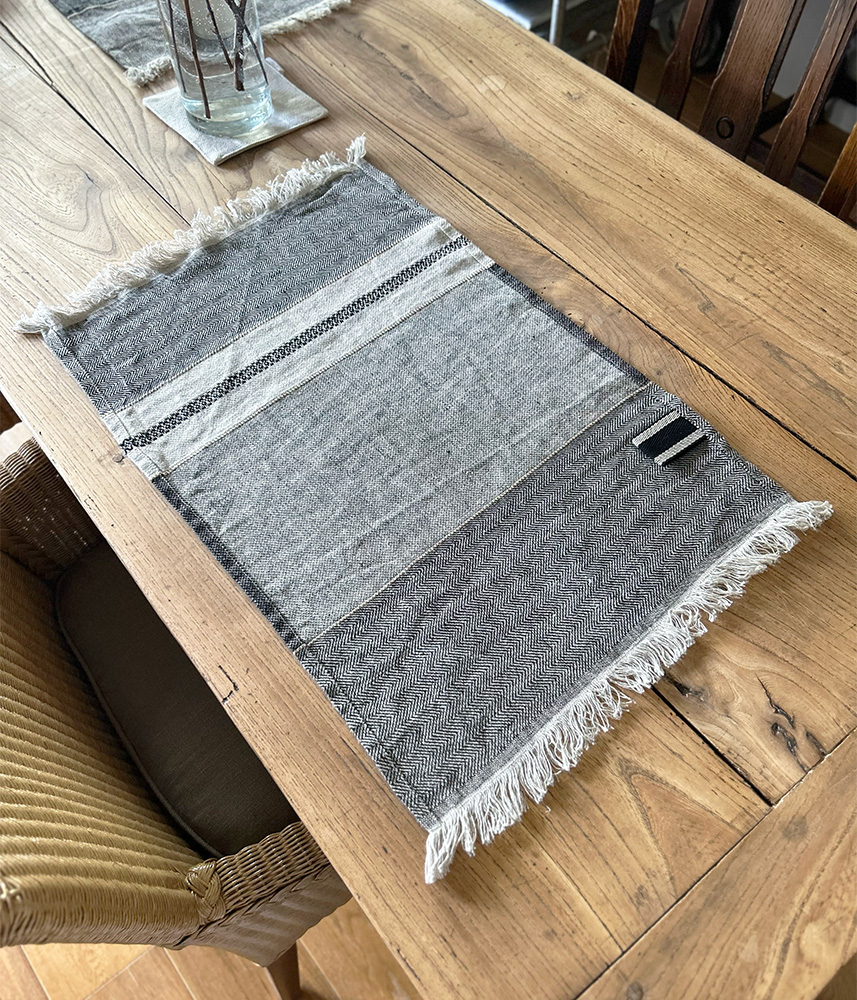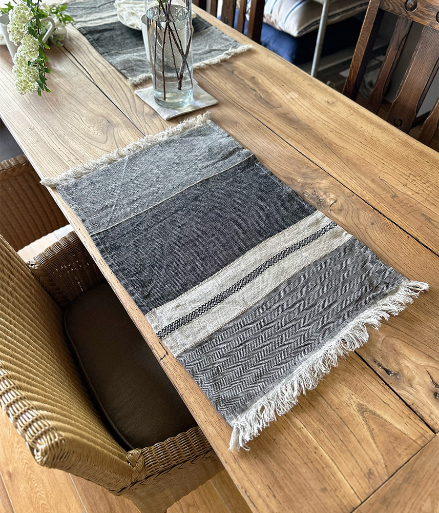 ベルギー産の上質なリネンを使用し、吸水性・速乾性に優れているため、タオルとしてはもちろん、ランチョンマットやカトラリークロスなどにもおすすめ。両サイドのフリンジが、ラフすぎずナチュラルな雰囲気を演出します。