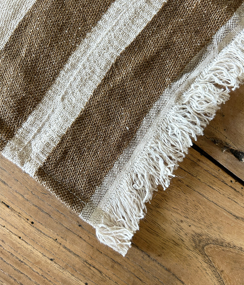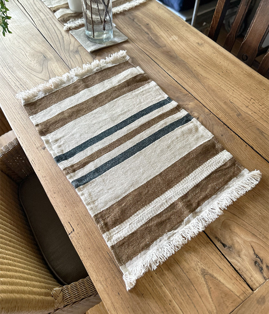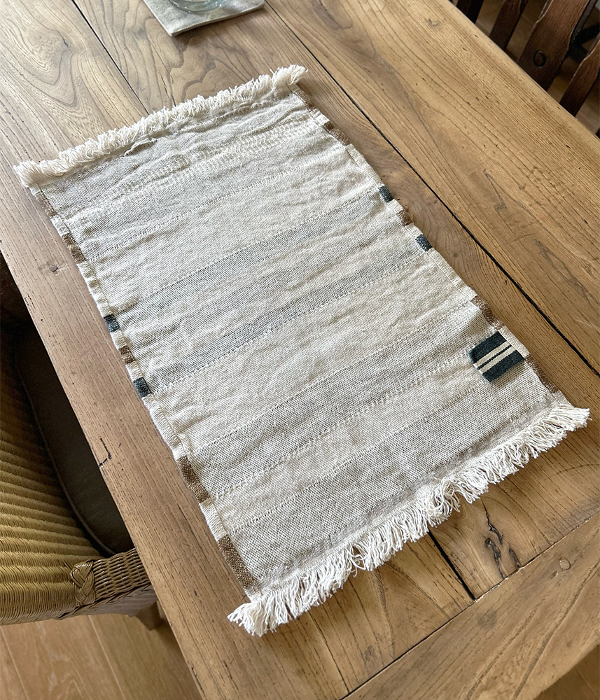 ベルギー産の上質なリネンは、吸水性・速乾性に優れ、タオルとしてはもちろん、ランチョンマットやクロスとしても幅広くお使いいただけます。両サイドのフリンジが軽やかなアクセントに。