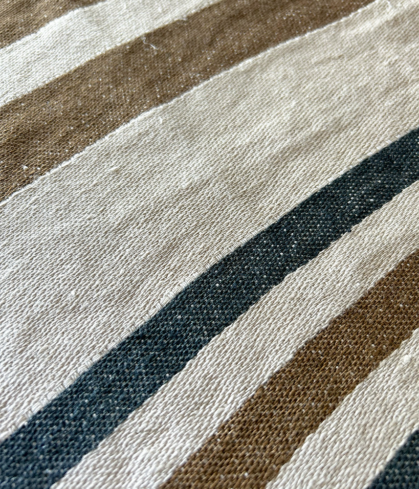 ナチュラルなフラックスカラーをベースに、ウォームオークやネイビーグレーのラインが映える上品なデザイン。落ち着いたトーンはどんな空間にもなじみながら、さりげない存在感を放ちます。