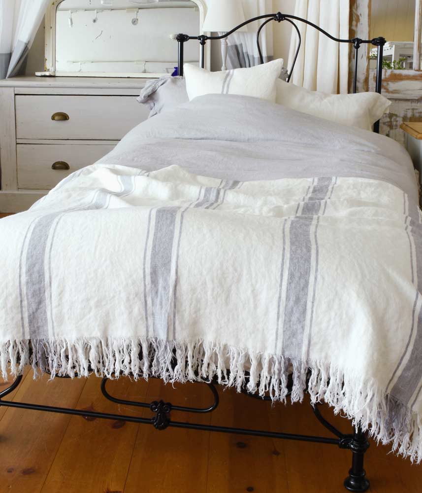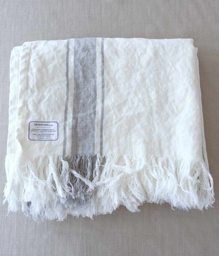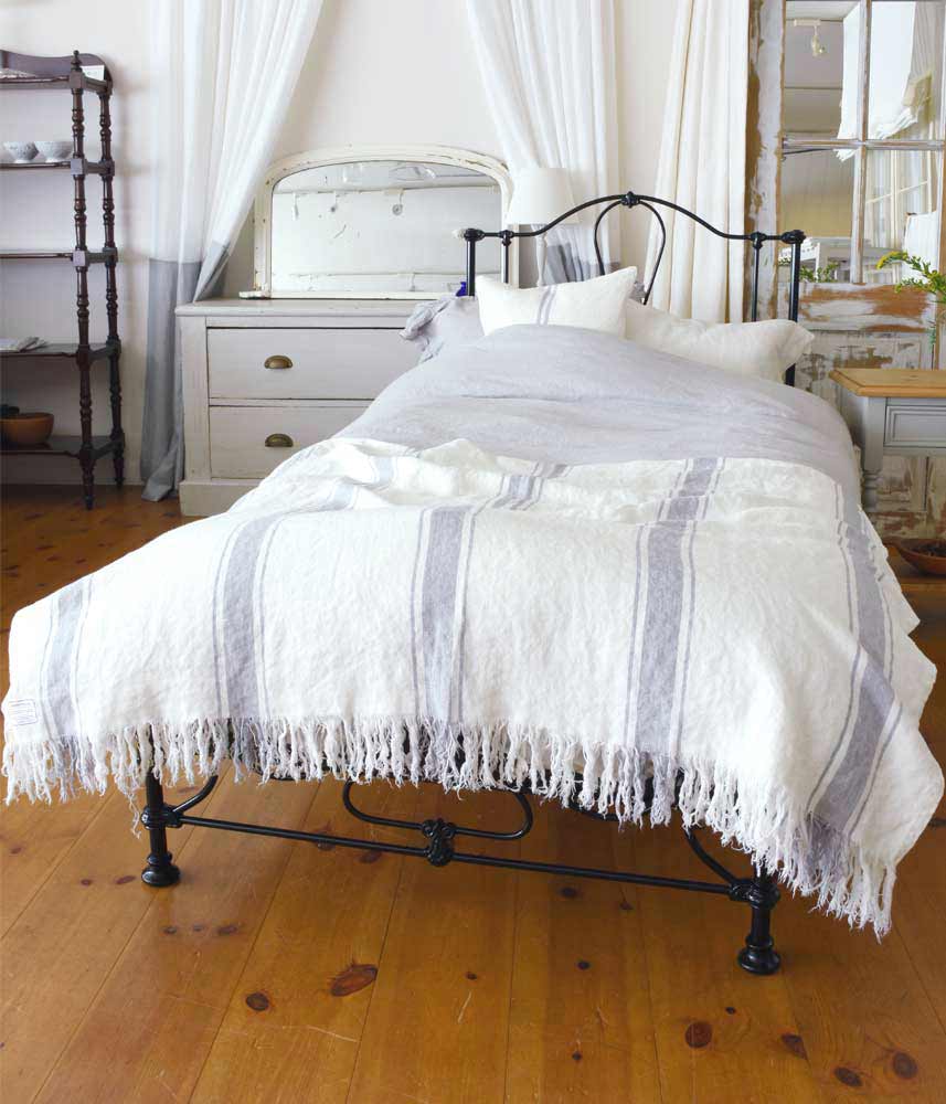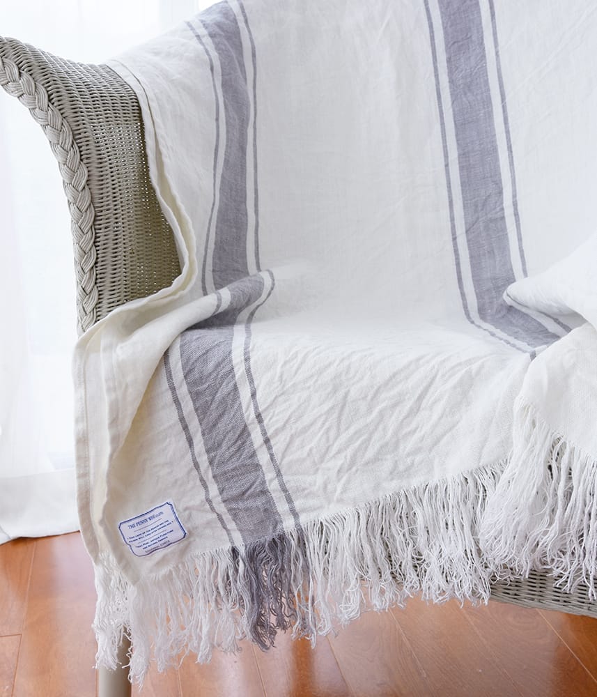 大判なのでベッドスプレッドとしても使えます。ウォッシュのかかったリネンだからこそ優しい肌触り。厚手の真っ白なホワイト地に、フレッシュな白地に、太めのライトグレーストライプ。