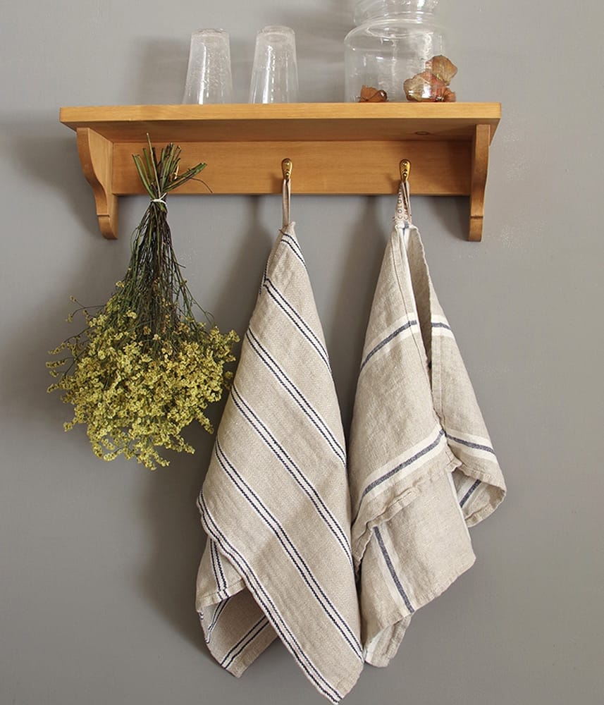 コロニアルチェックでロングセラーのマリン(ストライプ)シリーズで製作したキッチンクロスは、さらりと心地よい手触りの優しい質感が特徴。自然素材の良さは、優れた吸水性と速乾性。頻繁に洗っても丈夫で長持ち。ロゴ入りのループが付いているので、キッチン周りのフックに掛けられます。