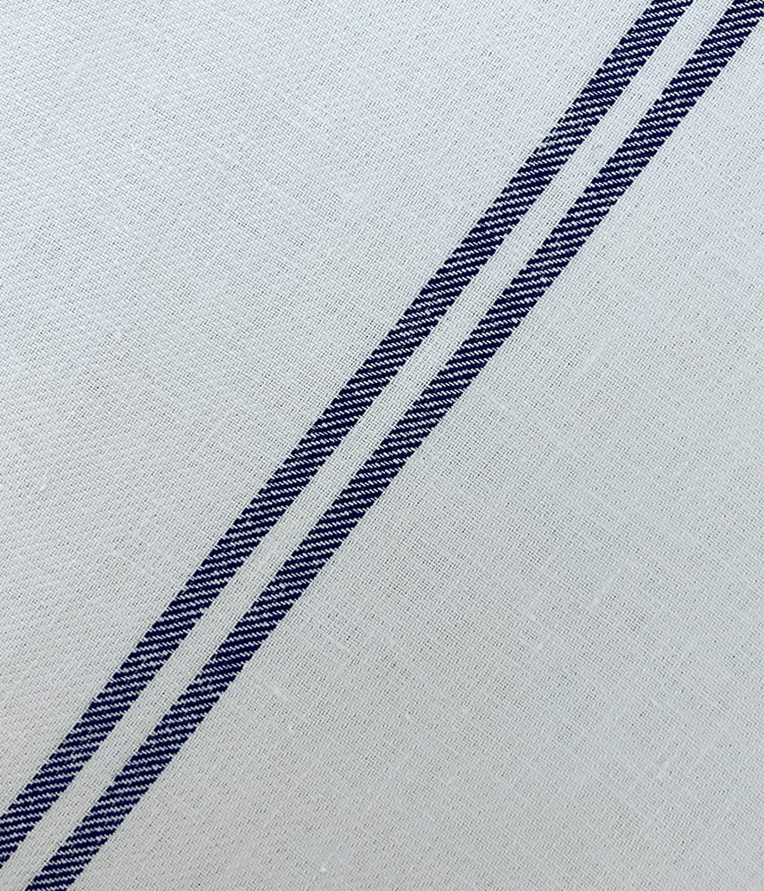 リトアニア製のマリンシリーズは中厚地のリネン100%。リナマリン1はシリーズの中でも柔らかい綾織りリネン生地です。ざっくりと織られた白地リネンに細い2本のネイビーストライプがきりっとしていて清々しい雰囲気を与えてくれます。