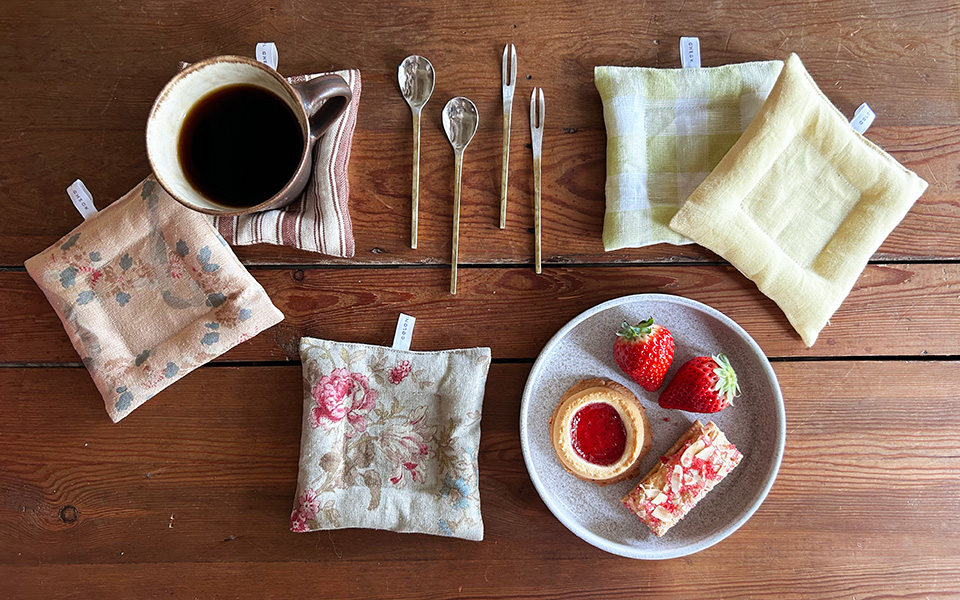 花柄やチェック、淡いストライプ。 どれも取り入れやすい色と柄で、強く主張することはありません。 白い器とも合わせやすく、木のテーブルにも自然と馴染みます。 同じコースターでも、合わせる器や時間帯によって、表情が変わって見えるのも楽しいところです。
