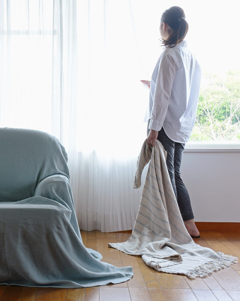 通気性に優れているので、汗ばむ季節も快適に過ごせます。 心地よさとデザイン性を兼ね備えた、コロニアルチェックのオリジナルブランケットは、使うごとに風合いが増して、毎日の暮らしにそっと馴染みます。