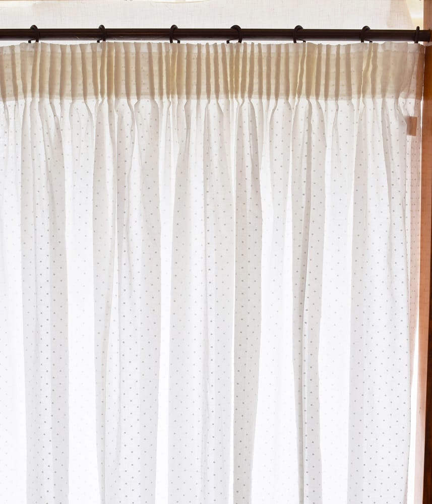 うっとりするような生地の表情が美しいギャザーカーテンをモスリンハーフネンとモスリンスノードットでご用意しました。