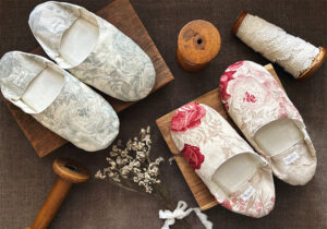 イギリスの老舗ファブリックメーカー「Kate Forman社」の大輪のバラ柄リネンを贅沢に使った、新作のルームシューズが届きました。