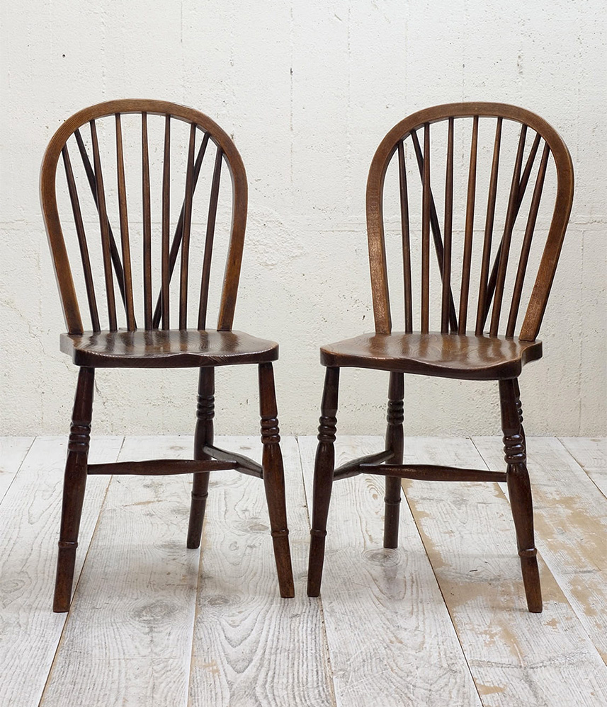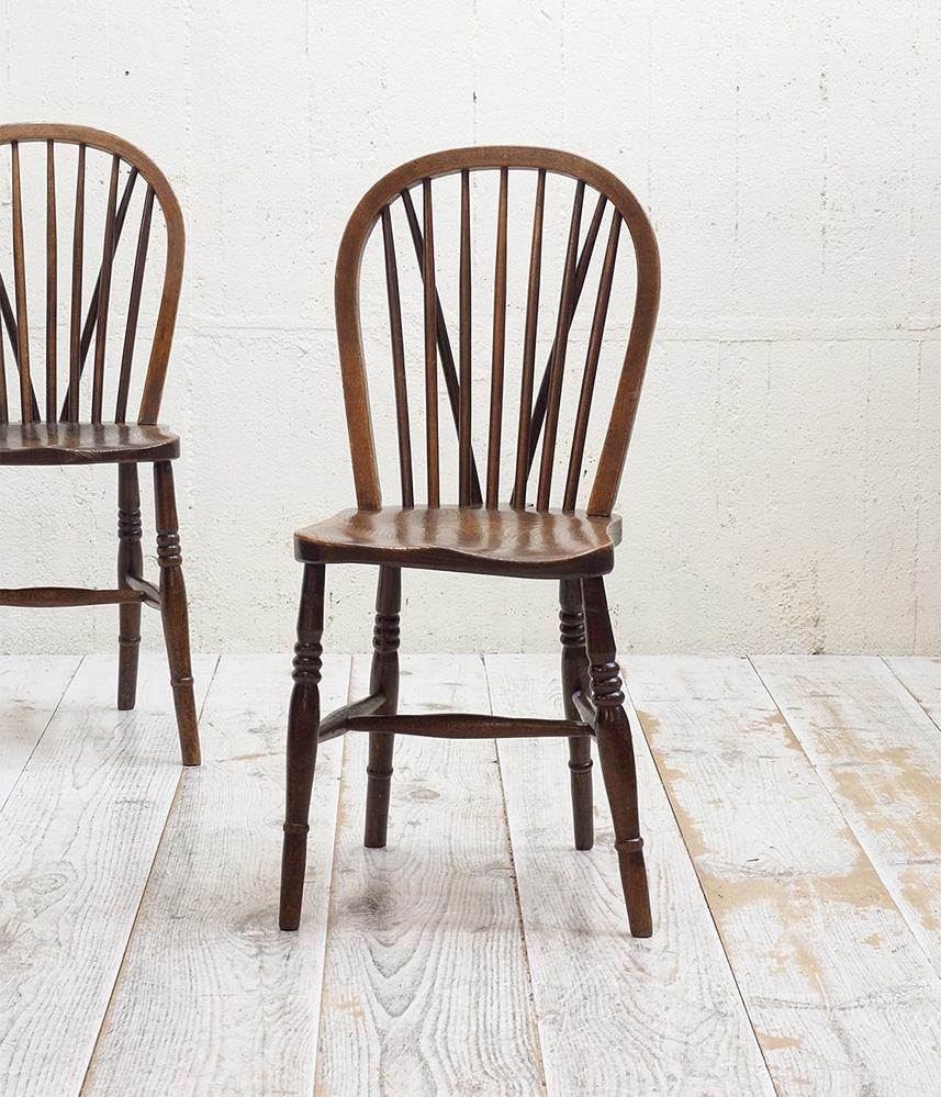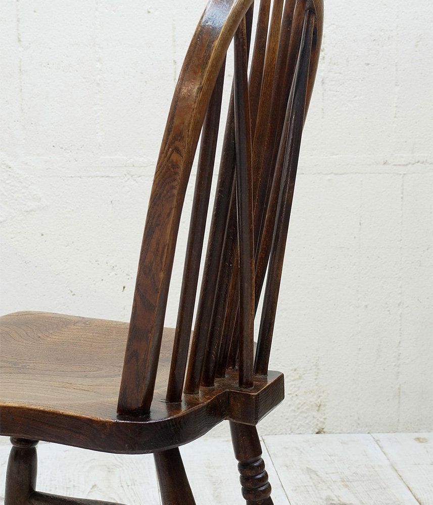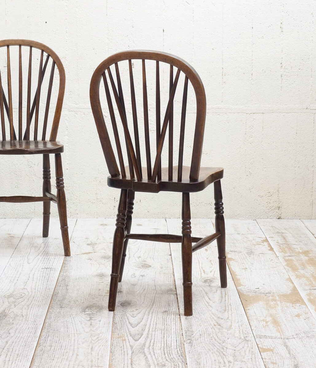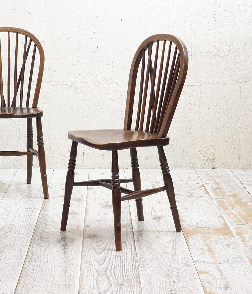 推定1930年代、イギリス製のアンティークキッチンチェアです。スタンダードなフープバックのチェアです。背もたれが少し倒れたデザインなので通常のダイニングチェアより少しゆったりとした座り心地です。座面までの高さは45cmです。詳細撮影は右(a)の椅子をしています。こちらの椅子は両方ともメンテナンス済みです。