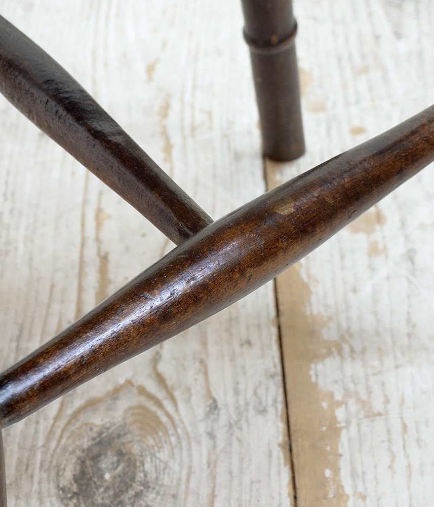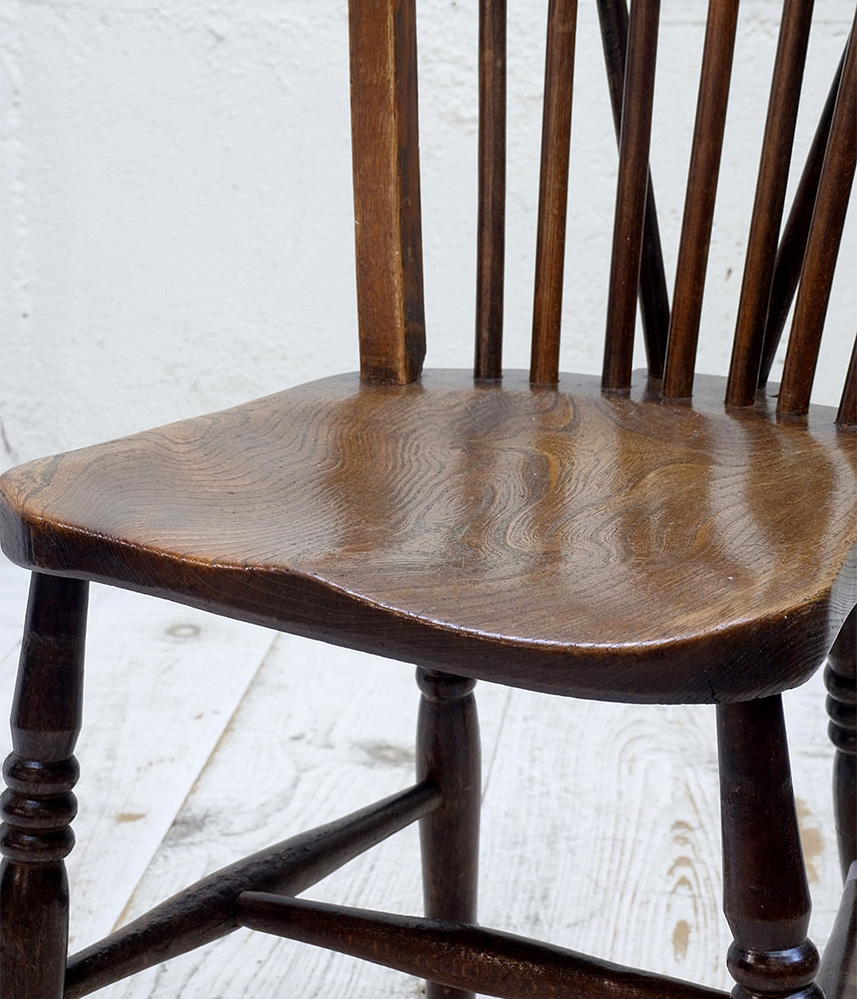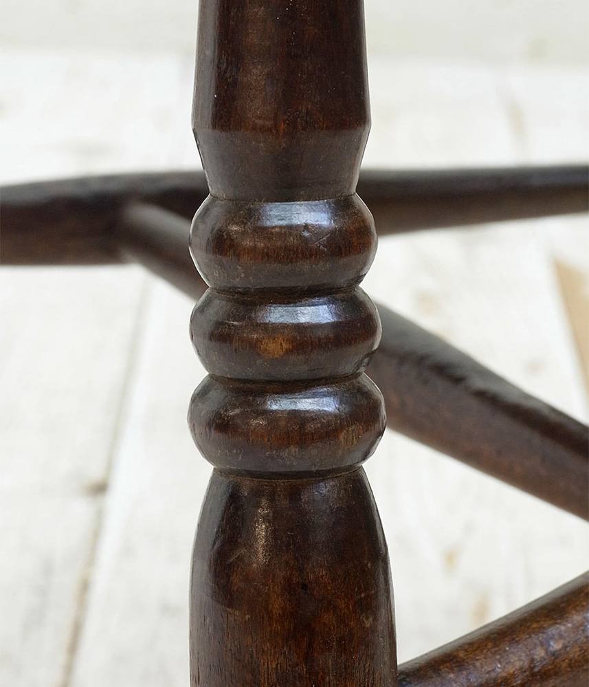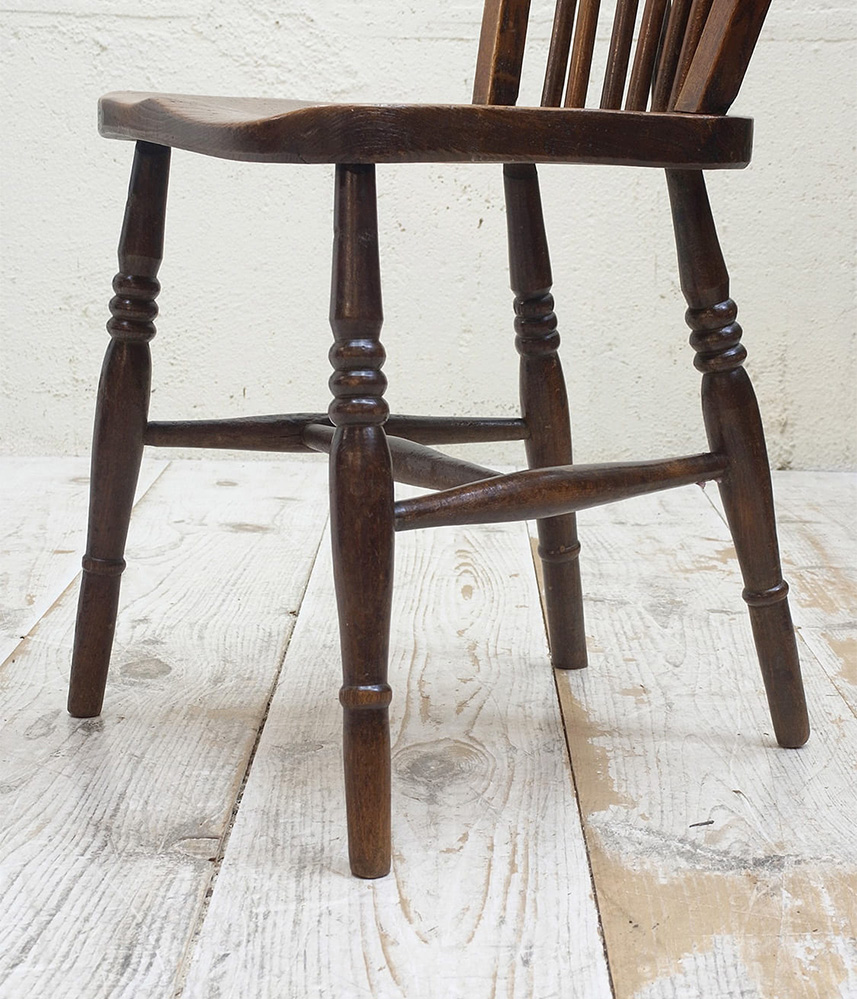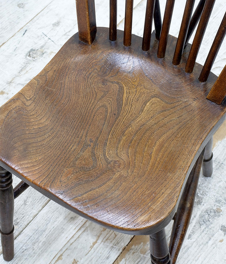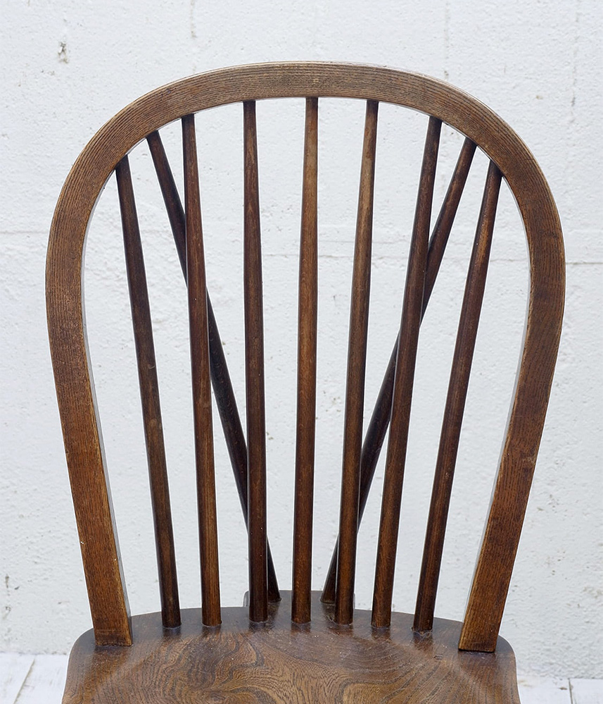 推定1930年代、イギリス製のアンティークキッチンチェアです。スタンダードなフープバックのチェアです。背もたれが少し倒れたデザインなので通常のダイニングチェアより少しゆったりとした座り心地です。座面までの高さは45cmです。詳細撮影は右(a)の椅子をしています。こちらの椅子は両方ともメンテナンス済みです。