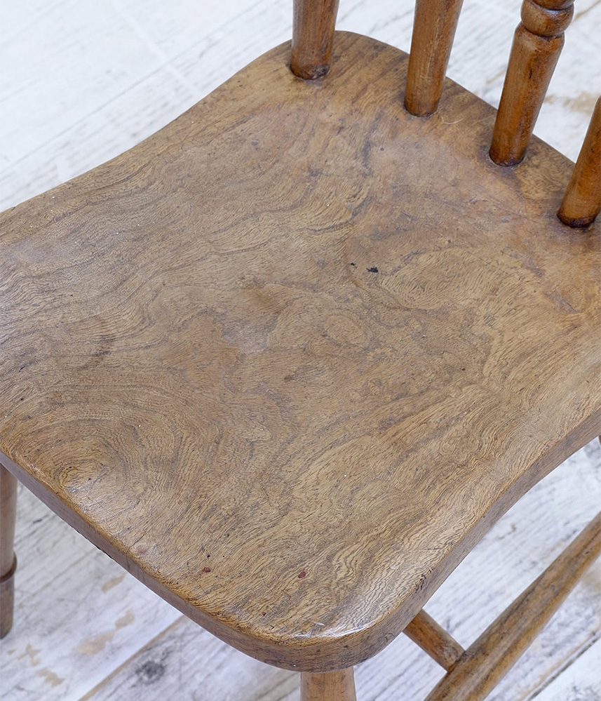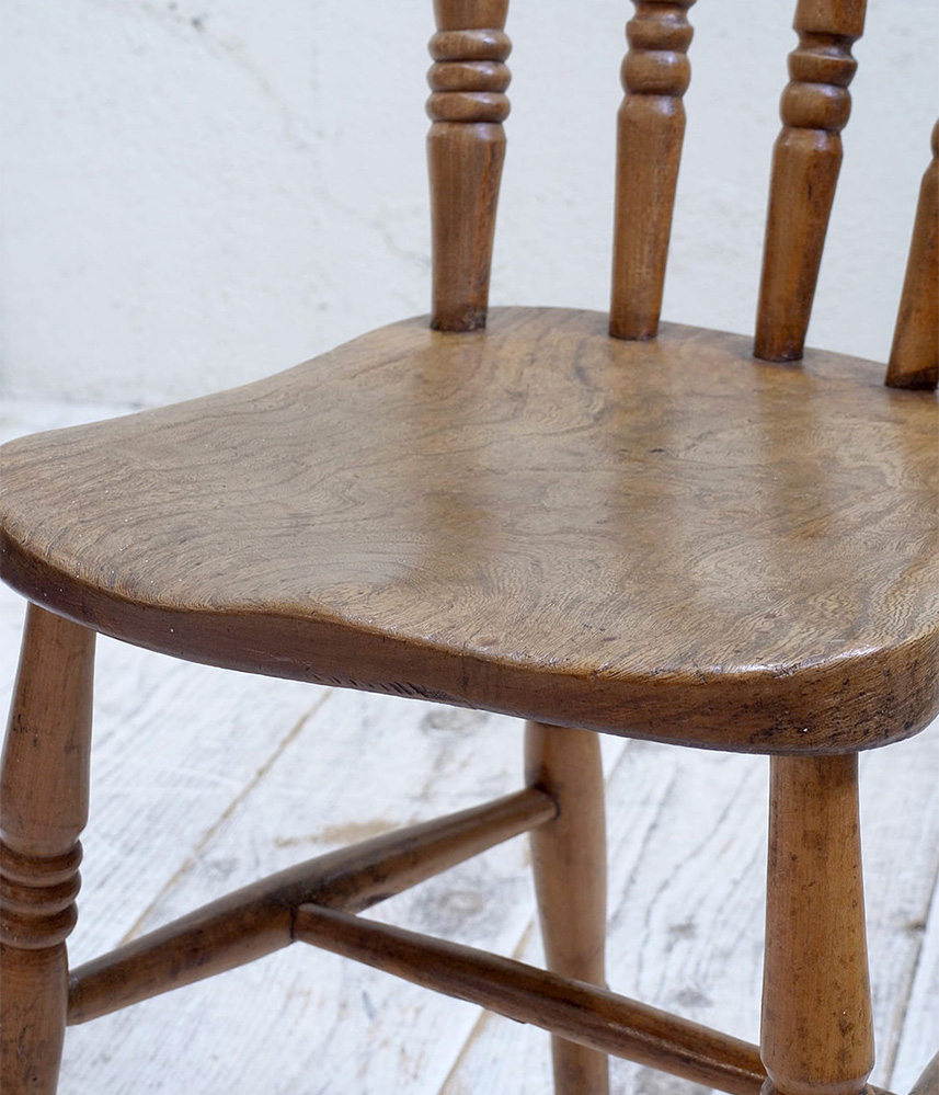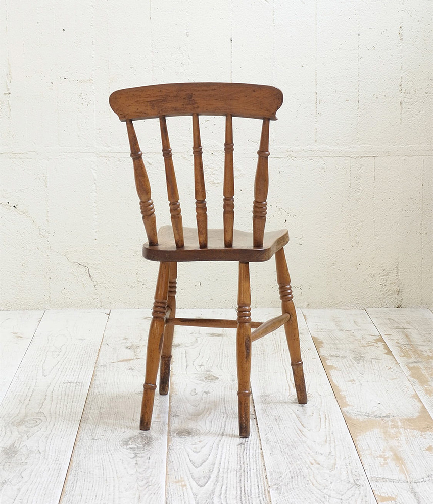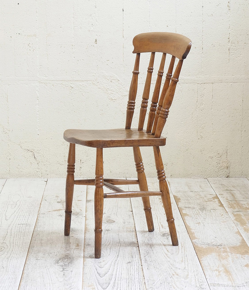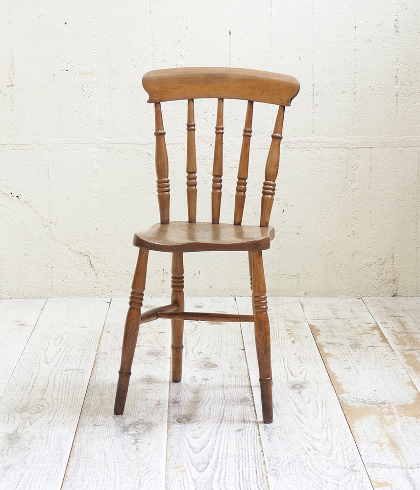 推定1930年代、イギリス製のキッチンチェアです。キッチンチェアとは文字通りキッチンで使う作業椅子のことでイギリスの農家(ファームハウス)や一般家庭で使われていました。デザインが近いものが複数あることも多く、揃ったデザインに統一できるため日本ではダイニングチェアとして人気があります。座面までの高さは45.5cmです。こちらの椅子はメンテナンス済みです。キッチンチェアの中でもとてもコンパクトなサイズ感です。
