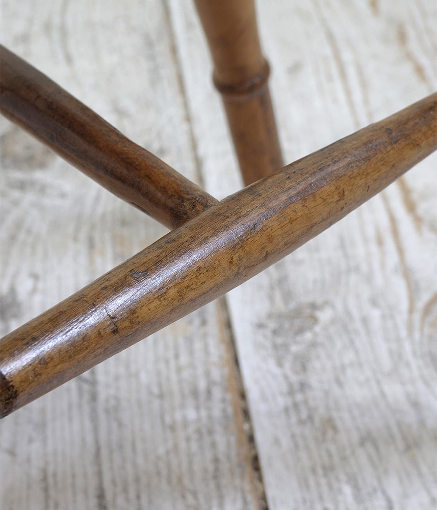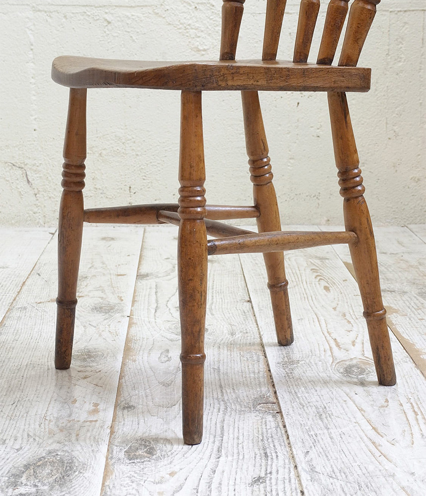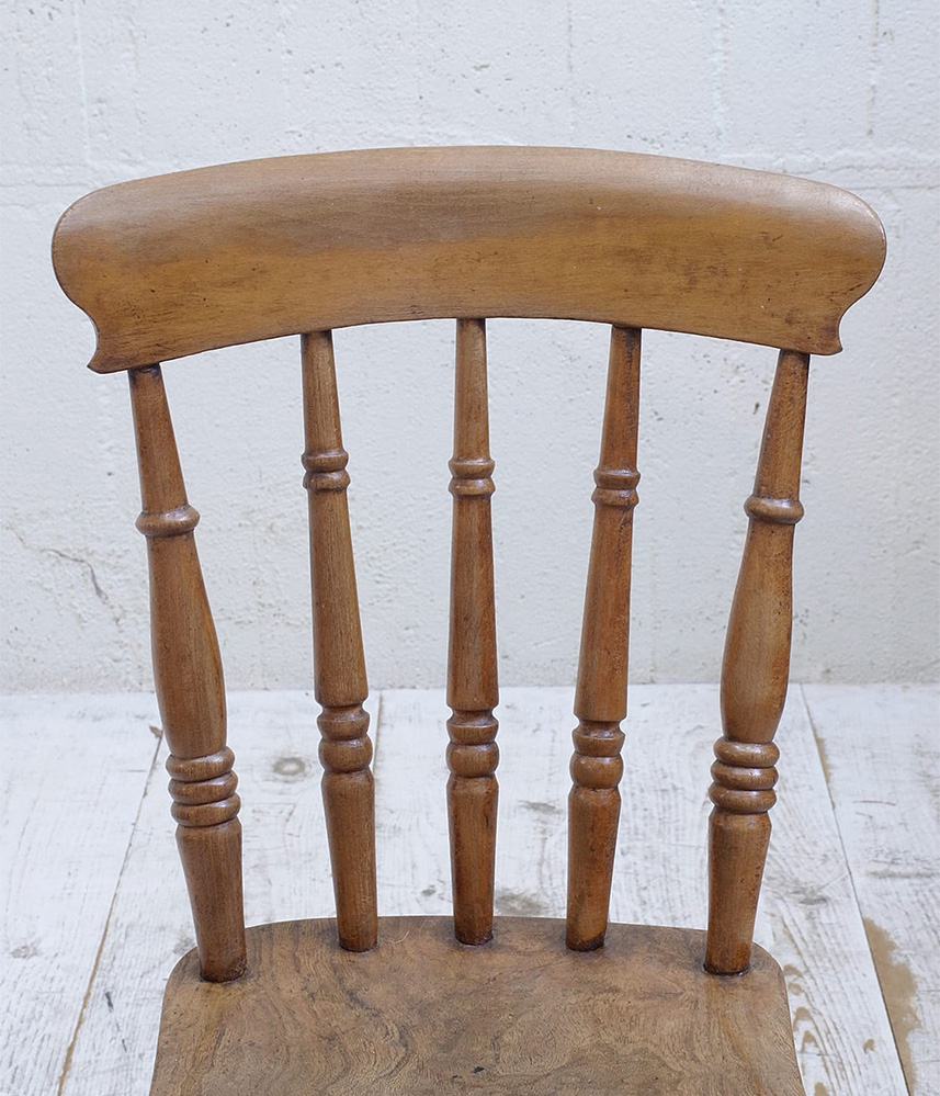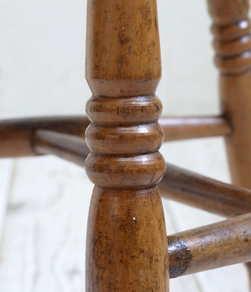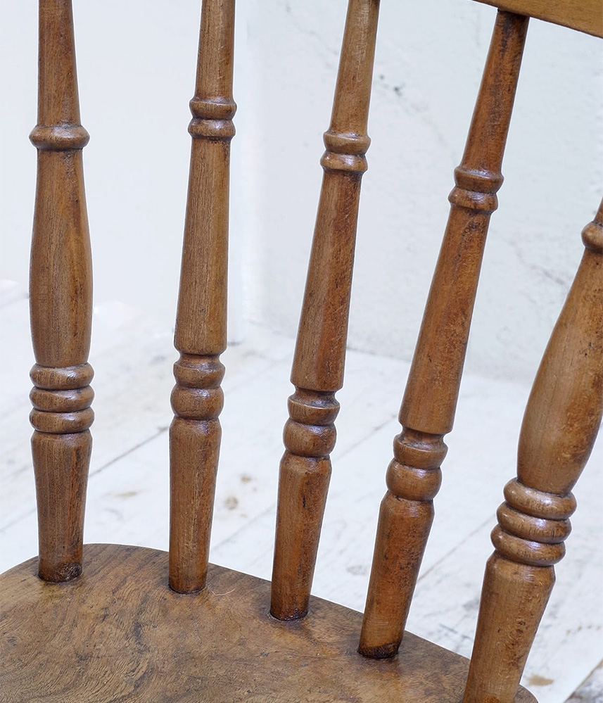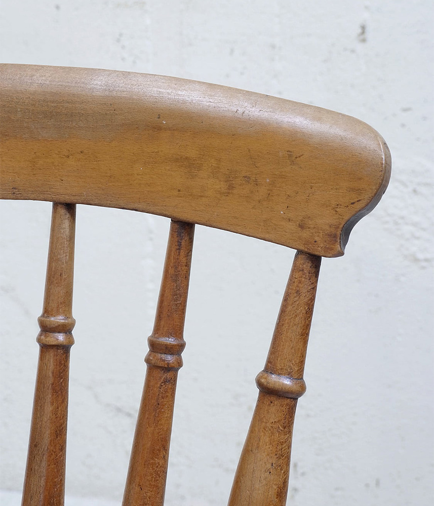 推定1930年代、イギリス製のキッチンチェアです。キッチンチェアとは文字通りキッチンで使う作業椅子のことでイギリスの農家(ファームハウス)や一般家庭で使われていました。デザインが近いものが複数あることも多く、揃ったデザインに統一できるため日本ではダイニングチェアとして人気があります。座面までの高さは45.5cmです。こちらの椅子はメンテナンス済みです。キッチンチェアの中でもとてもコンパクトなサイズ感です。