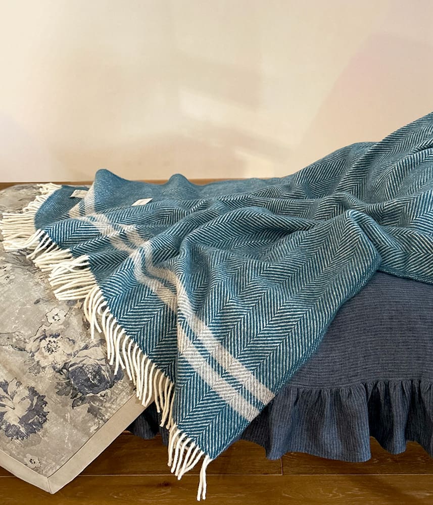 ティールブルーというグリーンブルーカラーのフィッシュボーンにグレーのラインが2本入り、オフホワイトのフリンジがアクセントです。